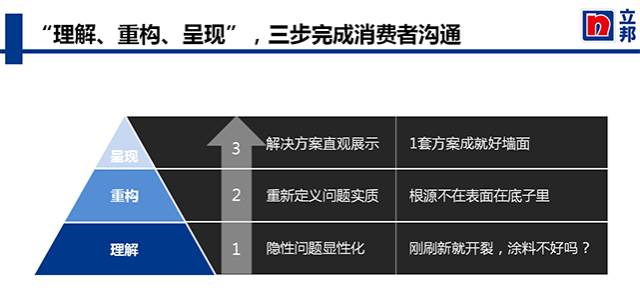 ➤ “理解、重构、呈现”三步完成消费者沟通。通过将用户的隐性问题显性化,让用户了解到问题的本质,重新定义认识问题的实质性,进而提出直观展示的解决方案。